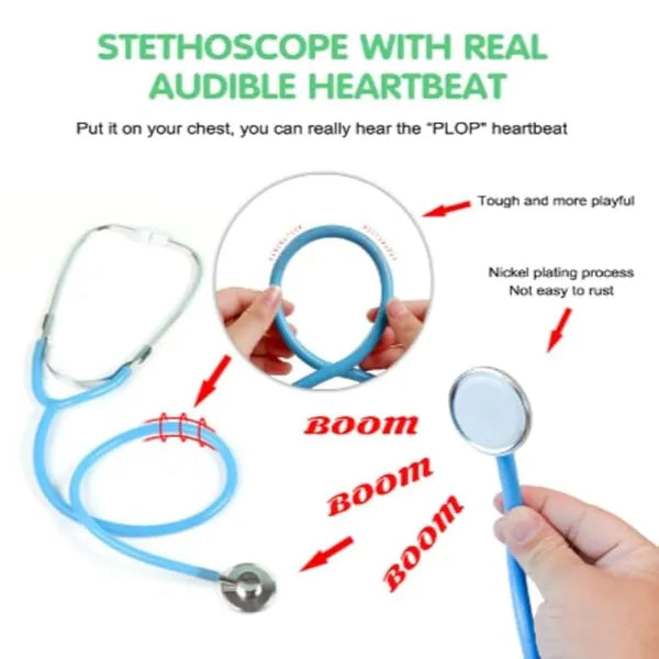 Turn playtime into a fun learning experience with this Doctor Play Kit designed for curious little minds. Packed with all the essentials — stethoscope, thermometer, syringe, scissors, reflex hammer, and more, this kit encourages imaginative role play while teaching kids about health and care.